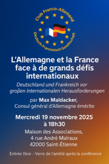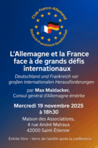 Vous êtes sûrement nombreux à connaitre M. Max Maldacker, qui a été consul général à Lyon. Il revient dans notre région et plus précisément à St Etienne, pour une conférence dont le thème est brûlant d’actualité: L’Allemagne et la France face à de grands défis internationaux